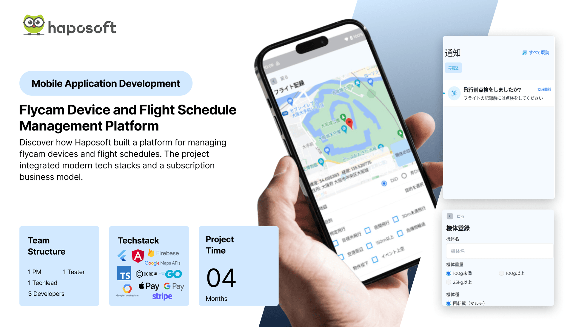 Haposoft delivered a platform that solved the client's key challenges in managing flycam devices and flight schedules. By centralizing their workflow and integrating real-time data updates, we made it easier for users to track and manage their flights. We also implemented a seamless payment system for subscription services, which helped the client offer more value to their users. The project was completed on time, using technologies like Flutter, Firebase, and Google Cloud, which not only met the current needs but also positioned the platform for future growth.