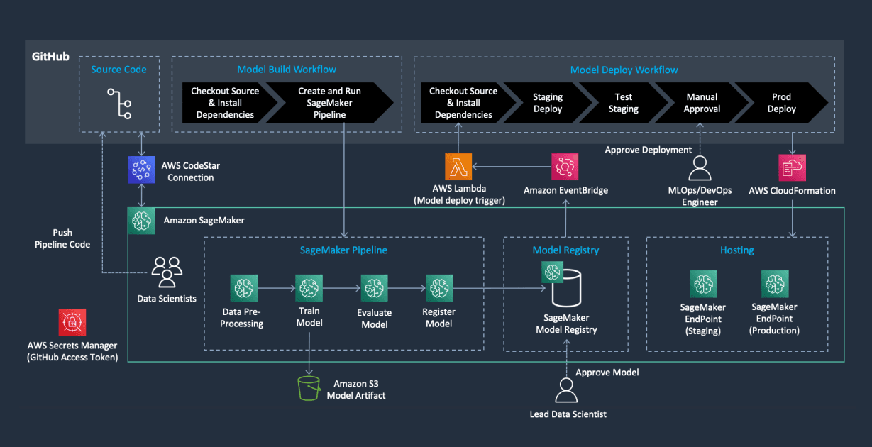 本番環境のMLシステムはスタンドアロンのモデルとしてではなく、完全なパイプラインとして扱うべきです。これは重要なポイントです。なぜなら、主なボトルネックはモデル自体ではなく、オーケストレーション、データの品質、必要に応じてシステムを再学習させる能力から来ることが多いからです。AWSにおけるAI/MLのデプロイメントでは、その広い視点が動作するデモと生産準備が整ったシステムの違いを生み出します。モデルはワークフローの一部に過ぎません。